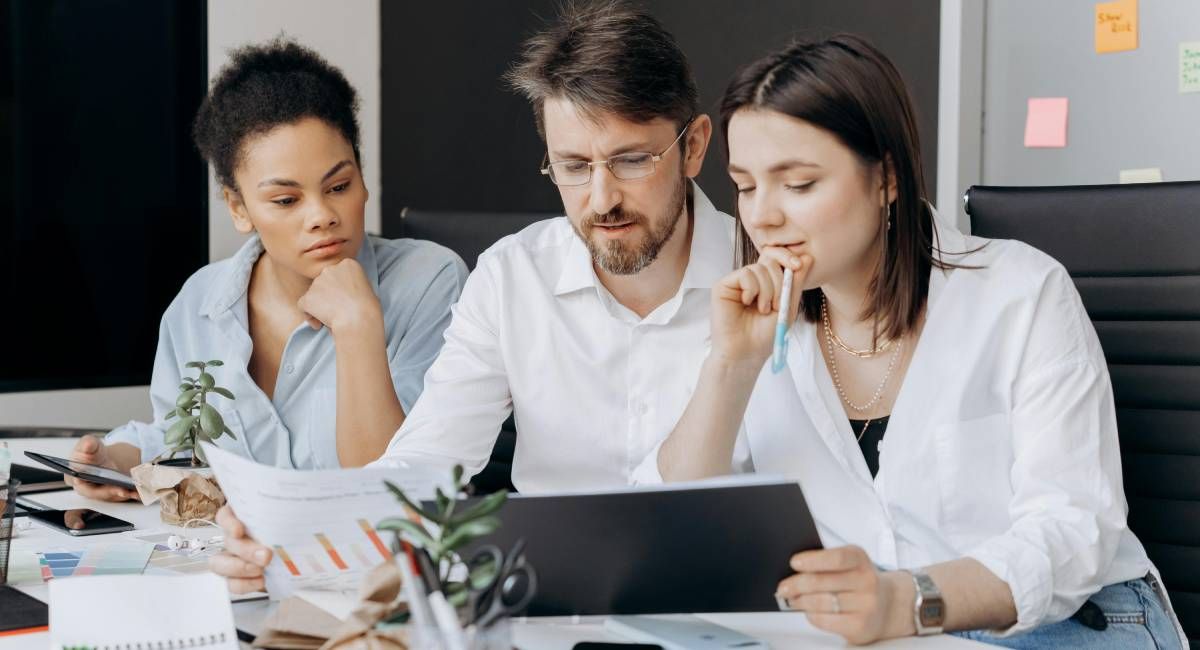 A man and woman looking at a laptop, deciding whether to make a purchase